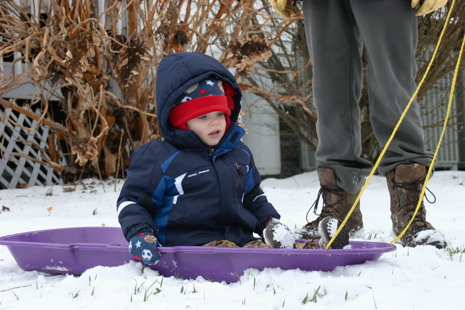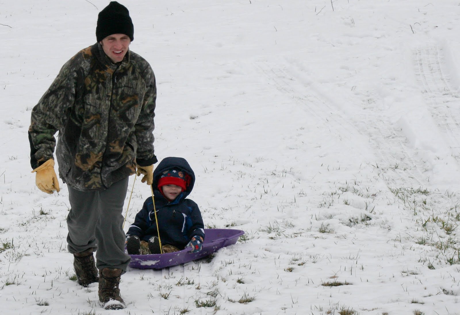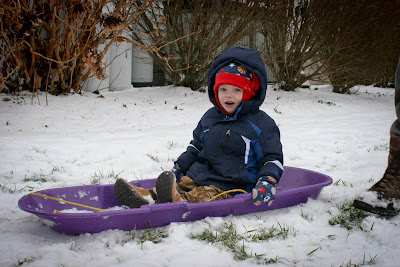 There is still some snow left on the ground here too, and since we were out of town for the big 7-8 inches that Wake Forest got during Christmas, this is really Colt’s first time playing in it! He loved the “purple sled” for some reason? And had a blast sledding and throwing snowballs with Daddy and Papaw. This was AFTER they fed the cows and I learned that they had been throwing cow patties at each other too. . . ?! Really guys? Come on. . .