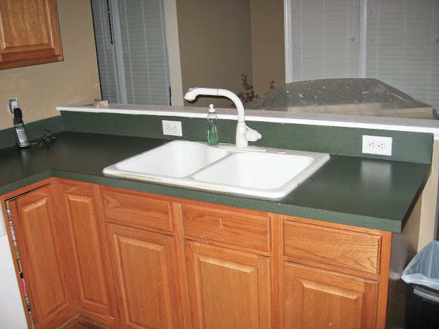 We painted the cabinets and purchased new hardware. That in and of itself was a HUGE improvement! David bought the knobs off ebay at 1/3 of the price they would have been at Lowe’s. We purchased our granite from Lowe’s though. They all know us by name there because we are in and out so much! I think we are close enough with the staff to have them over for a “finished product” party π Anyways, we price matched and used a coupon so they “gave us some granite” (in their own words). It was a good deal too!