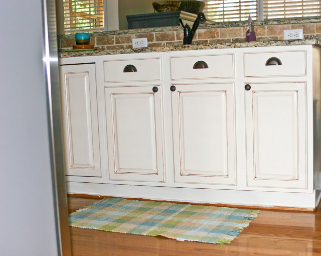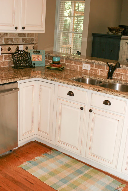 For our cabinets, we painted them an “antique white” color then glazed them with a mocha glaze. David applied the glaze and I followed behind wiping off the cabinets but leaving some brown accent in the corners. We like the finished product. This cost about . . . $35 for a gallon of paint and glaze. Compare to thousands for new cabinets and a very similar look.