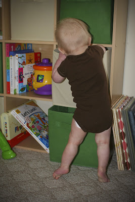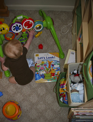 He has discovered the cubbies that we keep his toys in. They don’t stay there for long though once the day begins!
