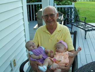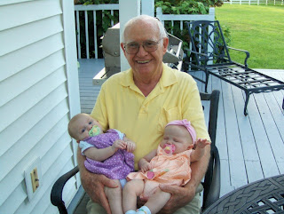 The evening that Colt David was born, we had planned a family “reunion” cookout at my parents house. The aunts, uncles, and cousins were in from out of town and we were supposed to eat at 6 pm. Well, David and I left the house for the hospital about 6 pm. We hated to miss it and all the precious little babies were there! Most of them came to the hospital a couple of hours later though, so the waiting room was full when little Colt arrived at 11:41! This is Sarah and my cousin’s baby girl Vivian. Papaw Tom has his hands full! Now there is Colt to add to the bunch and one more due in October! Christmas should be fun this year 🙂